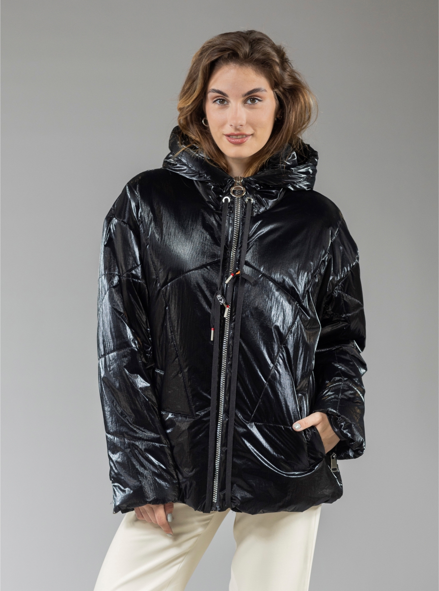Короткая куртка-пуховик чёрного цвета с лаковым блеском, выполненная из полиэстера. Плотное прилегание капюшона к голове обеспечивает декоративный шнур с узором. Сочетать данную модель можно с чем угодно: с юбками, платьями, брюками и любой другой одеждой, за счет своей универсальности она подойдёт к абсолютно любому вашему образу.Характеристики